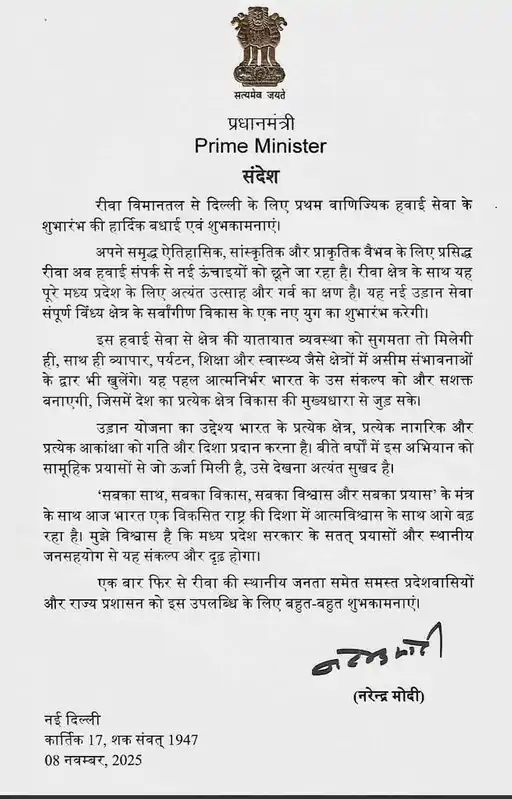 इस मौके पर प्रधानमंत्री नरेंद्र मोदी ने विशेष बधाई संदेश भेजा। पीएम ने लिखा कि रीवा विमानतल से दिल्ली के लिए पहली व्यावसायिक हवाई सेवा शुरू होने पर हार्दिक बधाई।