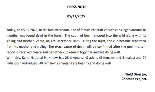 उन्होंने बताया कि मां वीरा और उसका दूसरा शावक पूरी तरह सुरक्षित और स्वस्थ हैं। दोनों पर रेडियो कॉलर के जरिए चौबीसों घंटे निगरानी रखी जा रही है। बाकी सभी चीतों का स्वास्थ्य भी सामान्य है। इस घटना के बाद अब कूनो में कुल 28 चीते बचे हैं – जिनमें 8 वयस्क (5 मादा, 3 नर) और भारत में जन्मे 20 शावक शामिल हैं।