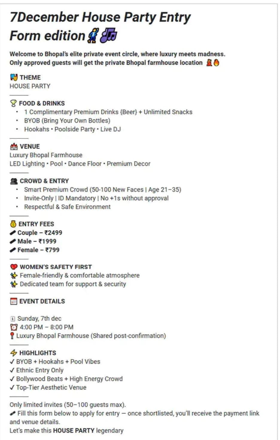 भोपाल पुलिस ने शिकायत मिलते ही जांच शुरू कर दी है। साइबर सेल की टीम फेक आईडी और ट्रांजेक्शन की छानबीन कर रही है। पुलिस ने युवाओं से अपील की है कि सोशल मीडिया पर आने वाले पार्टी इनवाइट्स या इवेंट्स पर आंख मूंदकर भरोसा न करें।