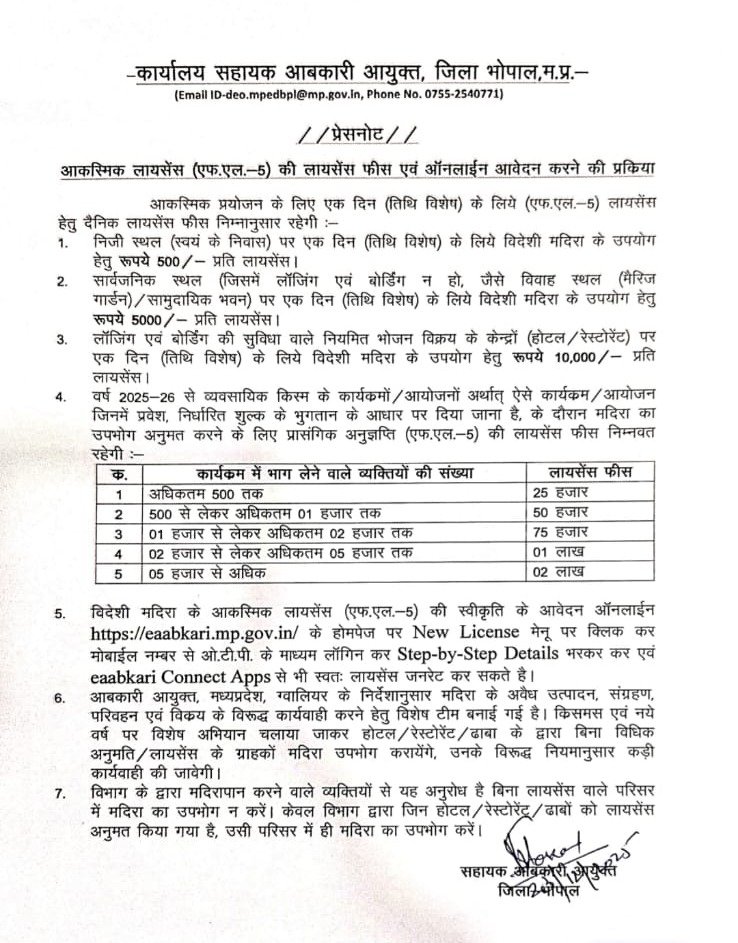 विदेशी शराब के लिए अलग से 10 हजार रुपये देने पड़ेंगे। यह लाइसेंस FL-5 श्रेणी के तहत जारी हो रहा है। आवेदन ऑनलाइन भी किया जा सकता है, जिससे प्रक्रिया आसान हो गई है। विभाग का कहना है कि नियमों का पालन करते हुए जश्न मनाया जाए ताकि कोई अवैध गतिविधि न हो।