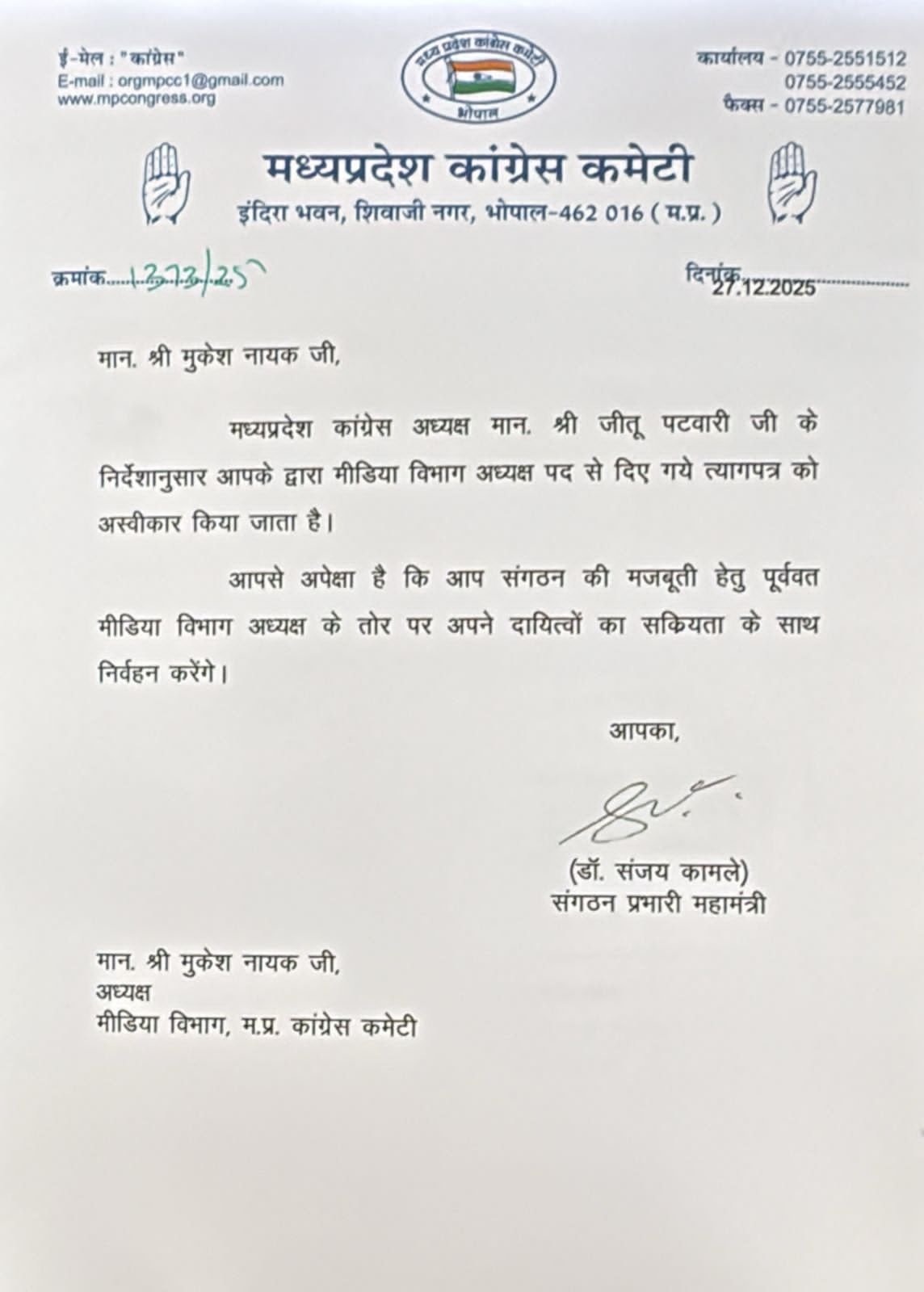 कांग्रेस ने एक्स (पूर्व ट्विटर) पर पोस्ट कर इसकी जानकारी दी। पोस्ट में लिखा गया कि मुकेश नायक द्वारा पारिवारिक कारणों से दिया गया त्यागपत्र अस्वीकार किया जाता है। उनसे अपेक्षा है कि वे मीडिया विभाग के अध्यक्ष के रूप में पहले की तरह दायित्व निभाते रहें।