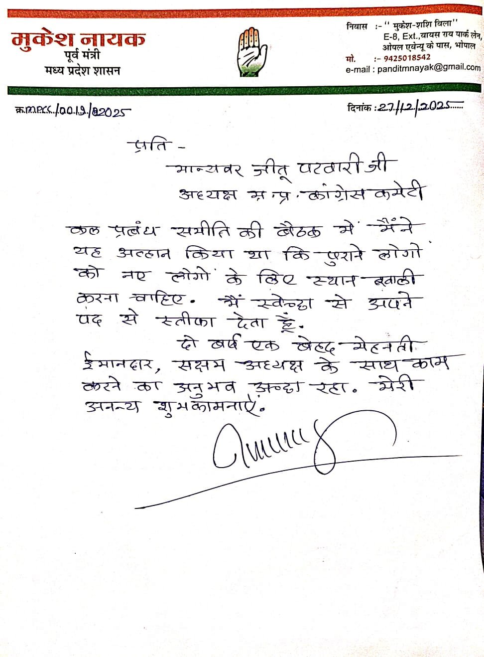 मुकेश नायक ने इस्तीफा पत्र में लिखा कि वे अपनी मर्जी से त्यागपत्र दे रहे हैं और पुराने लोगों को नए लोगों के लिए जगह खाली करनी चाहिए। हालांकि, प्रदेश कांग्रेस अध्यक्ष जीतू पटवारी ने उनका इस्तीफा अस्वीकार कर दिया।
