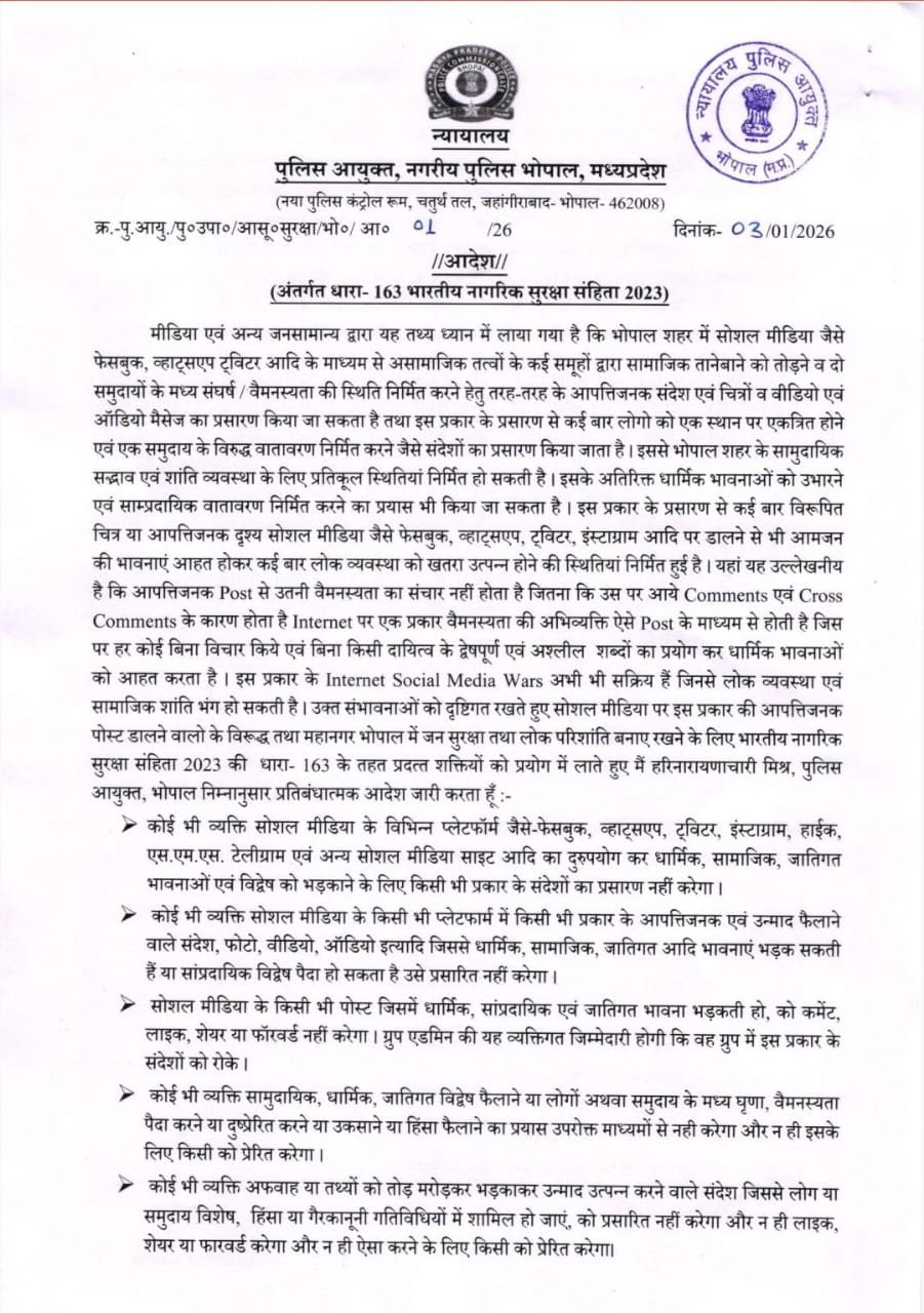कमिश्नर का कहना है कि पोस्ट से ज्यादा कमेंट और क्रॉस कमेंट समाज में वैमनस्यता फैलाते हैं। ऐसे सक्रिय सोशल मीडिया यूजर पर भारतीय नागरिक सुरक्षा संहिता (BNSS) 2023 की धारा 163 के तहत एक्शन लिया जाएगा। यह आदेश शहर में सांप्रदायिक सद्भाव बनाए रखने के लिए जारी किया गया है।