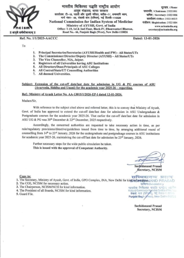 Ayush UG PG Admission Dates : भोपाल। मध्य प्रदेश समेत पूरे देश में आयुष (आयुर्वेद, सिद्धा, यूनानी) मेडिकल कॉलेजों में सत्र 2025-26 के लिए यूजी (स्नातक) और पीजी (एमडी/एमएस) में प्रवेश की आखिरी तारीख बढ़ा दी गई है। भारतीय चिकित्सा पद्धति राष्ट्रीय आयोग (NCISM) ने आयुष मंत्रालय की सहमति से यह फैसला लिया है। NCISM के सचिव सच्चिदानंद प्रसाद ने आज (मंगलवार) इस संबंध में पत्र जारी किया है।