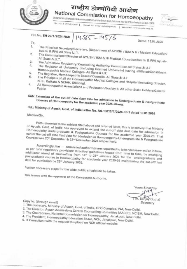 पुरानी तारीखों के मुताबिक यूजी की आखिरी डेट 20 दिसंबर 2025 और पीजी की 22 दिसंबर 2025 थी। अब यह तारीख बढ़ाकर 23 जनवरी 2026 कर दी गई है। इस एक्सटेंशन से देशभर में आयुष की लगभग 6500 से ज्यादा खाली सीटों को भरने का मौका मिलेगा। मध्य प्रदेश में आयुष कॉलेजों में कुल साढ़े चार हजार से ज्यादा यूजी सीटें हैं, जिनमें से अभी 900 से ज्यादा सीटें खाली हैं।