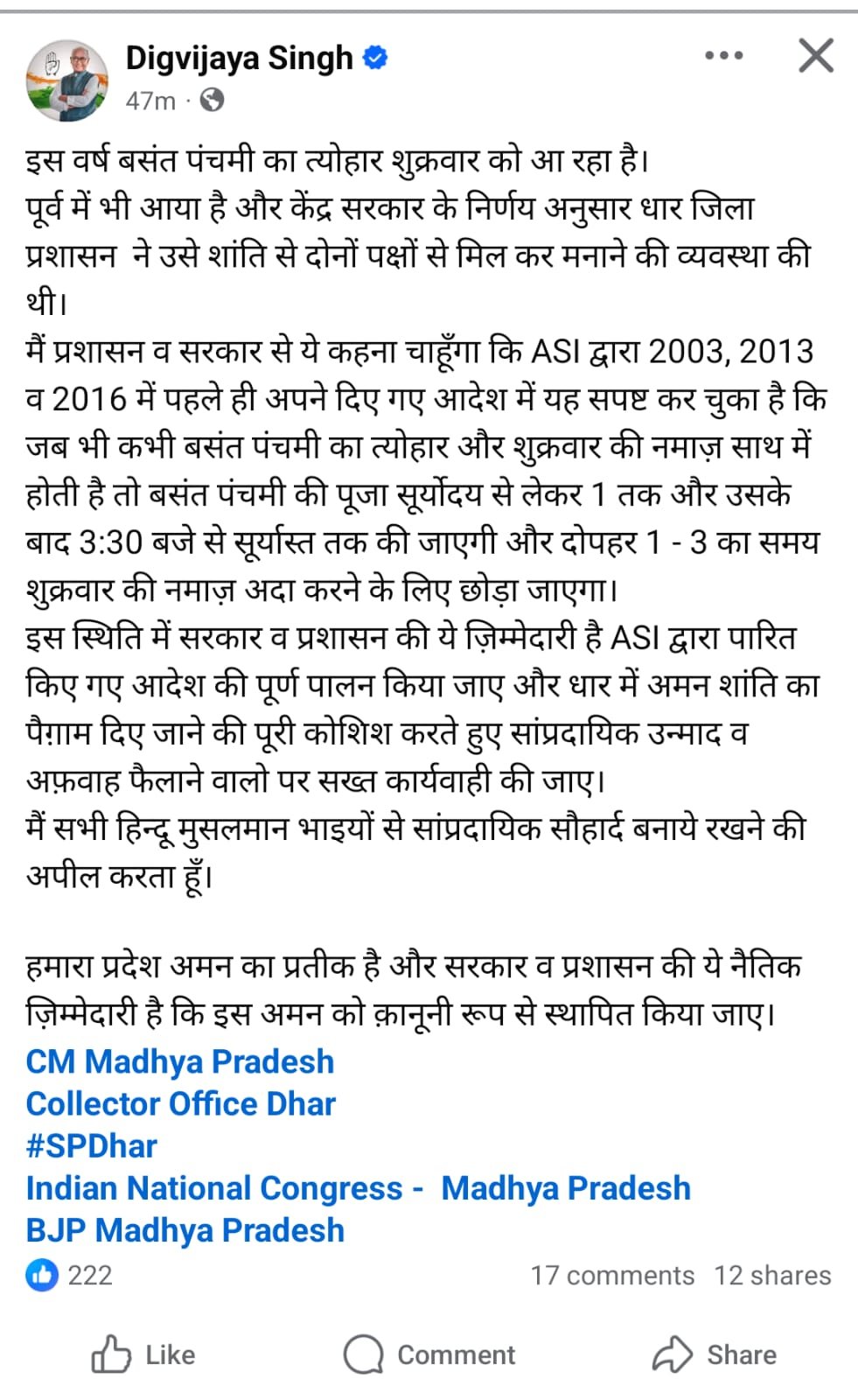 गौरतलब है कि, भोजशाल में वर्षों से विवाद चला आ रहा है। हिंदू पक्ष सरस्वती पूजा करता है और मुस्लिम पक्ष नमाज अदा करते हैं। ASI के पुराने आदेशों में समय बंटवारे का प्रावधान है। इस बार बसंत पंचमी शुक्रवार को होने से दोनों पक्षों के बीच तनाव की आशंका है। दिग्विजय सिंह के बयान से राजनीतिक गलियारे में हलचल मच गई है।