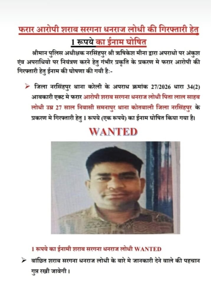 MP NEWS : नरसिंहपुर। नरसिंहपुर पुलिस ने फरार शराब तस्कर को पकड़ने के लिए इस बार आजमाया एक अलग और अनोखा तरीका है। आबकारी एक्ट के एक मामले में पुलिस ने फरार आरोपी पर सिर्फ ₹1 का इनाम घोषित किया है। यह घोषणा अब जिलेभर में चर्चा का विषय बन गई है। यह मामला करेली थाना क्षेत्र के अपराध क्रमांक 27/2026 से जुड़ा है। 9 जनवरी को पुलिस ने एक थार वाहन से 44 पेटी अवैध शराब और 2200 पाव बरामद किए थे। इस दौरान मौके से सुरेन्द्र लोधी और सलीम खान को गिरफ्तार कर लिया गया, लेकिन मुख्य आरोपी धनराज लोधी मौके से फरार हो गया। MP NEWS : पशुओं की हड्डियों से भरा वाहन पकड़ा गया, गौवंश अवशेष की आशंका पुलिस के मुताबिक धनराज लोधी अवैध शराब तस्करी के नेटवर्क का अहम हिस्सा है। उसकी गिरफ्तारी के लिए एसपी ऋषिकेश मीना ने ₹1 का इनाम घोषित किया है। पुलिस का कहना है कि इनाम की राशि प्रतीकात्मक है, इसका मकसद लोगों का ध्यान आरोपी की पहचान और गिरफ्तारी की ओर आकर्षित करना है। Bhopal news : नकली परमिट केस में बड़ा झटका, सोम डिस्टलरीज के डी-1 से FL-9 तक सभी लाइसेंस सस्पेंड पुलिस ने यह भी भरोसा दिलाया है कि आरोपी की जानकारी देने वाले व्यक्ति की पहचान पूरी तरह गोपनीय रखी जाएगी। ₹1 के इनाम ने आम लोगों के साथ-साथ सोशल मीडिया पर भी कई सवाल खड़े कर दिए हैं। अब देखना होगा कि यह अनोखी पहल फरार आरोपी को पकड़ने में कितनी कारगर साबित होती है।