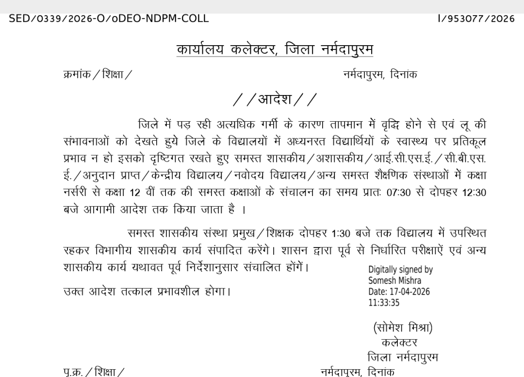 जिला कलेक्टर सोमेश मिश्रा ने आदेश जारी करते हुए कहा है कि अब जिले के सभी सरकारी और निजी स्कूल सुबह 7:30 बजे से दोपहर 12:30 बजे तक ही संचालित होंगे। यह आदेश तत्काल प्रभाव से लागू कर दिया गया है।